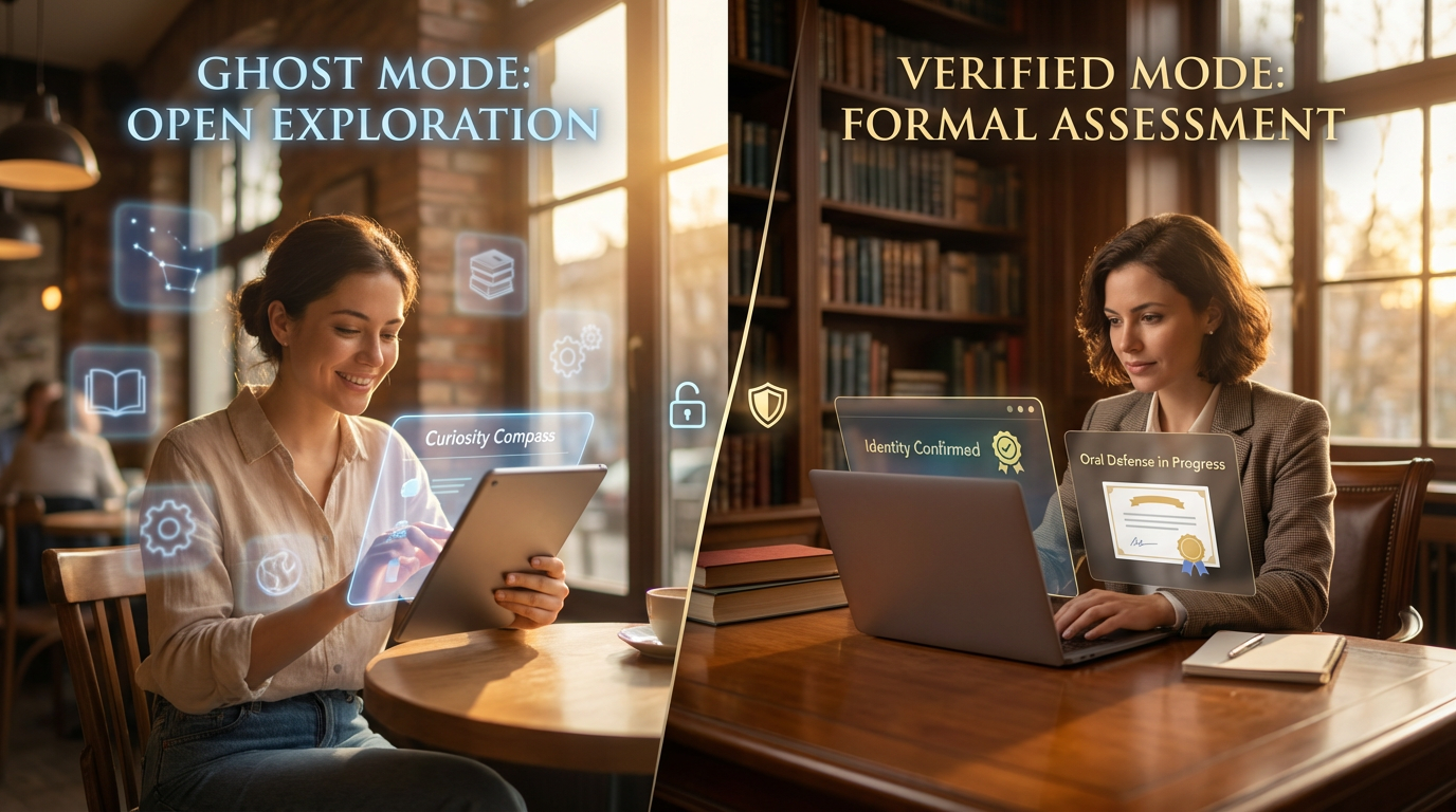 In ghost mode, a learner can explore courses, test ideas, and use the tutoring system freely without attaching those interactions to an official profile.