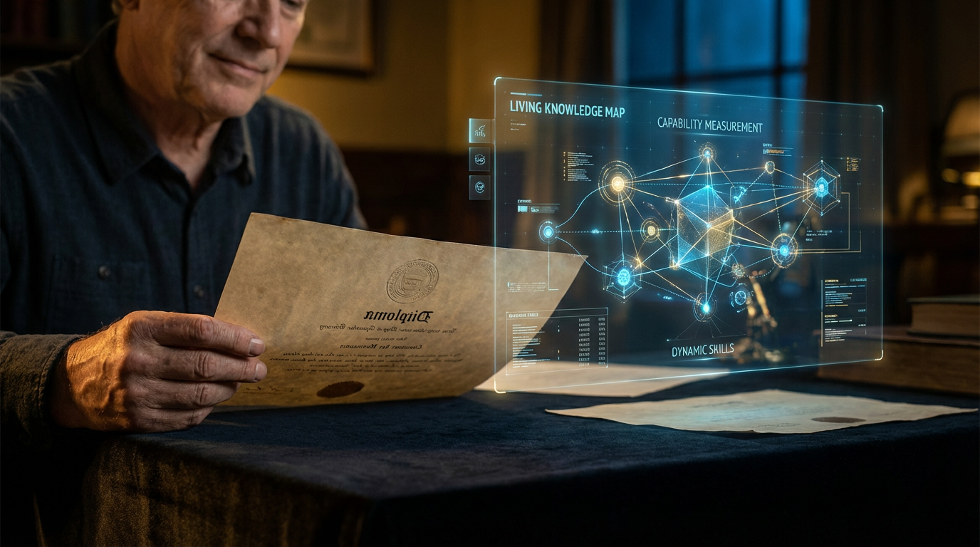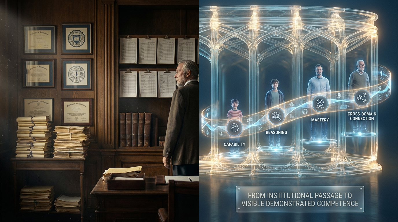 The old unit of trust is institutional prestige, credit hours, transcript sequence, and degree title. The new unit of trust could become verified demonstrated competence over time.