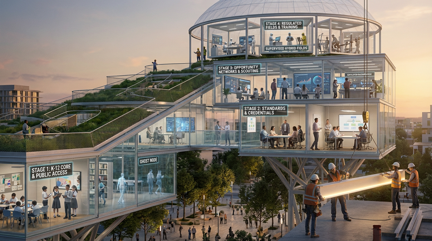 This shift begins earlier than college. In childhood, it means replacing uneven access to strong instruction with a more consistent public academic layer. In adolescence, it means making unusual ability easier to detect and support. In adulthood, it means allowing retraining, specialization, and continued growth to remain visible and legible rather than disappearing into disconnected credentials and résumé fragments.