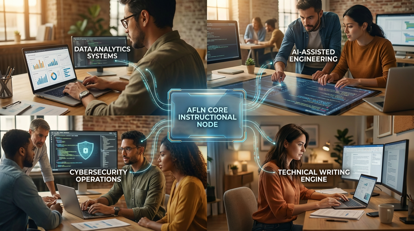 At the higher-education and workforce level, the strongest first-wave candidates are cognitive fields with heavily digital workflows and clear assessment structures. Business administration, project management, communications, digital marketing, technical writing, data analytics, software development, quality assurance, IT support, systems fundamentals, cybersecurity fundamentals, bookkeeping, operations, supply chain coordination, HR operations, recruiting operations, legal research support, and liberal studies all fall into this category.
