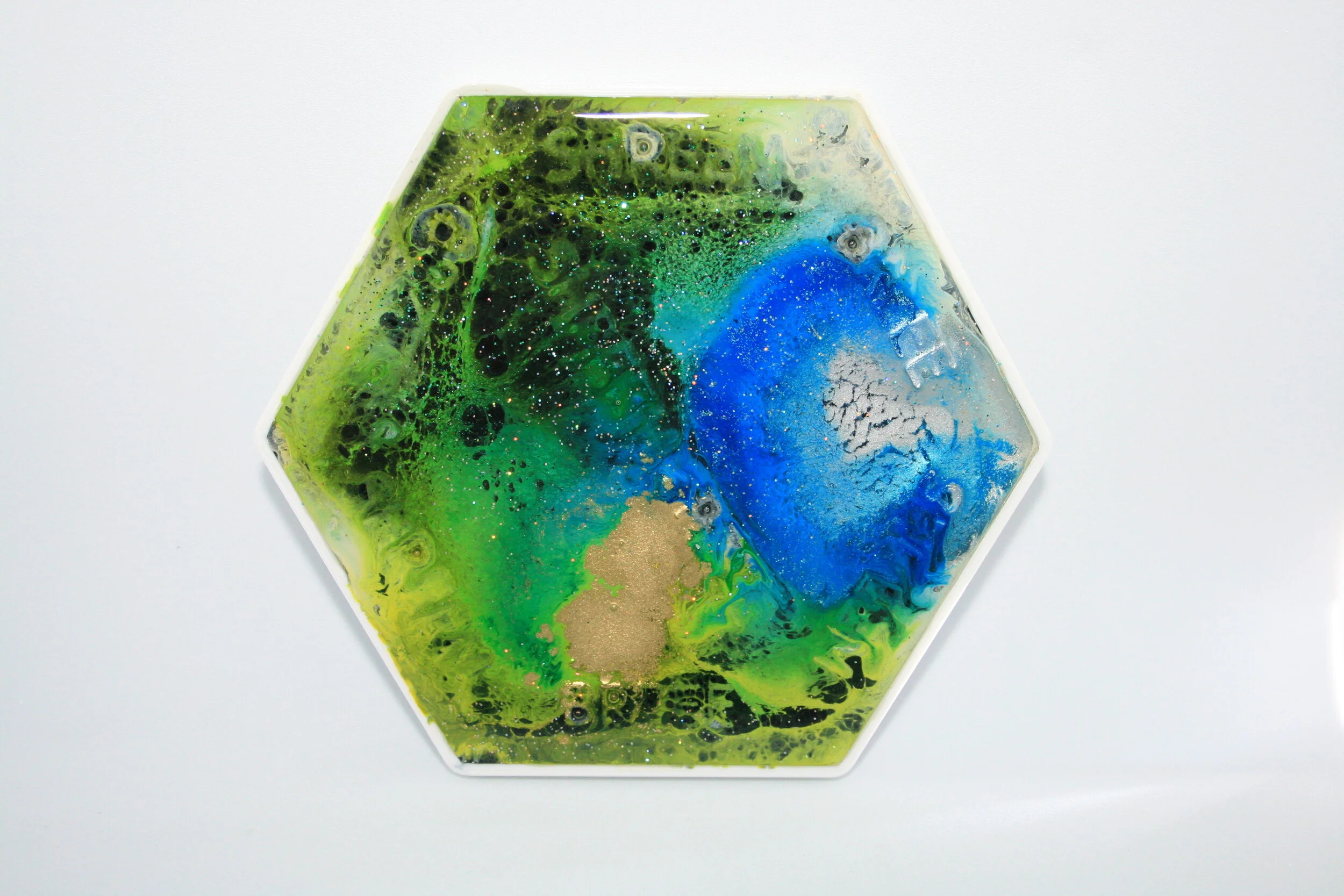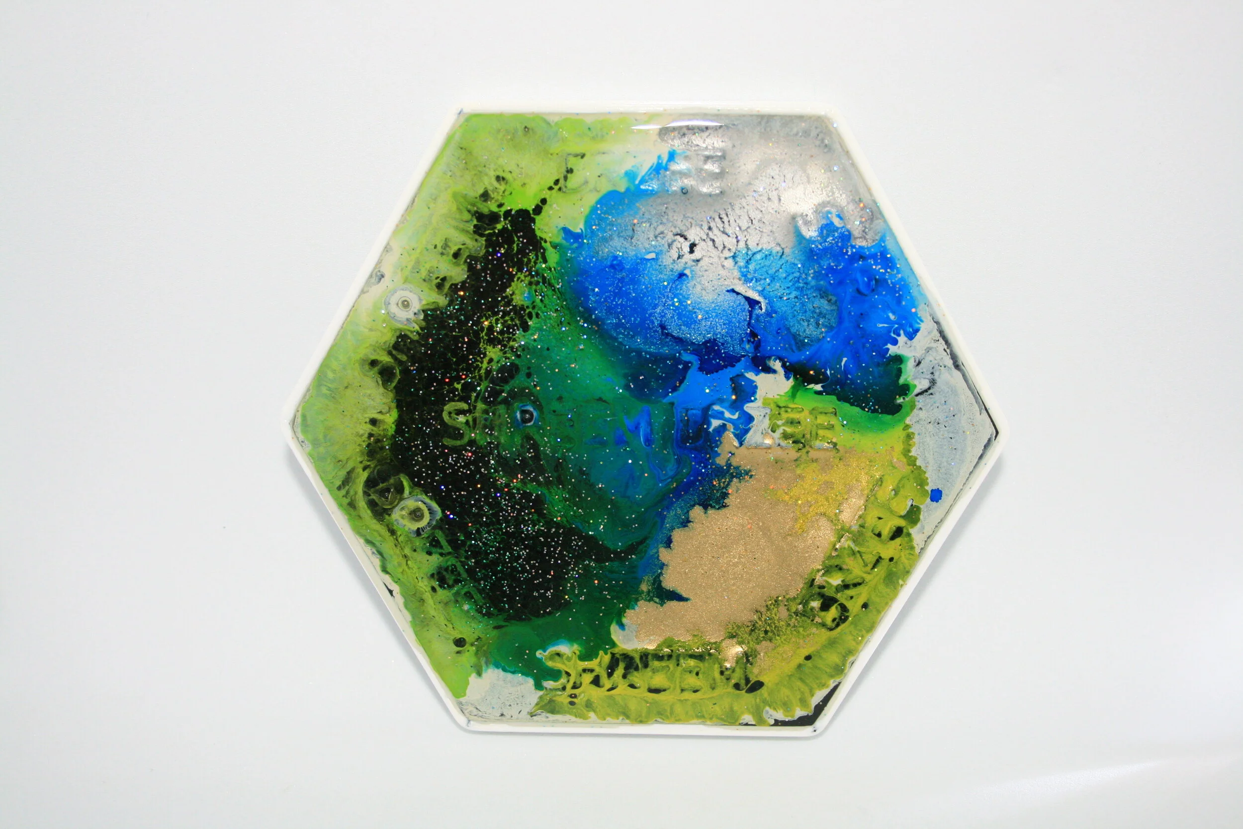 Shungite infused SHREEM BRZEE wealth mantra hexagon honeycomb lattice coasters with NO FELT backing in white PLA. Alcohol ink, glitter, non toxic epoxy bar and table top resin.