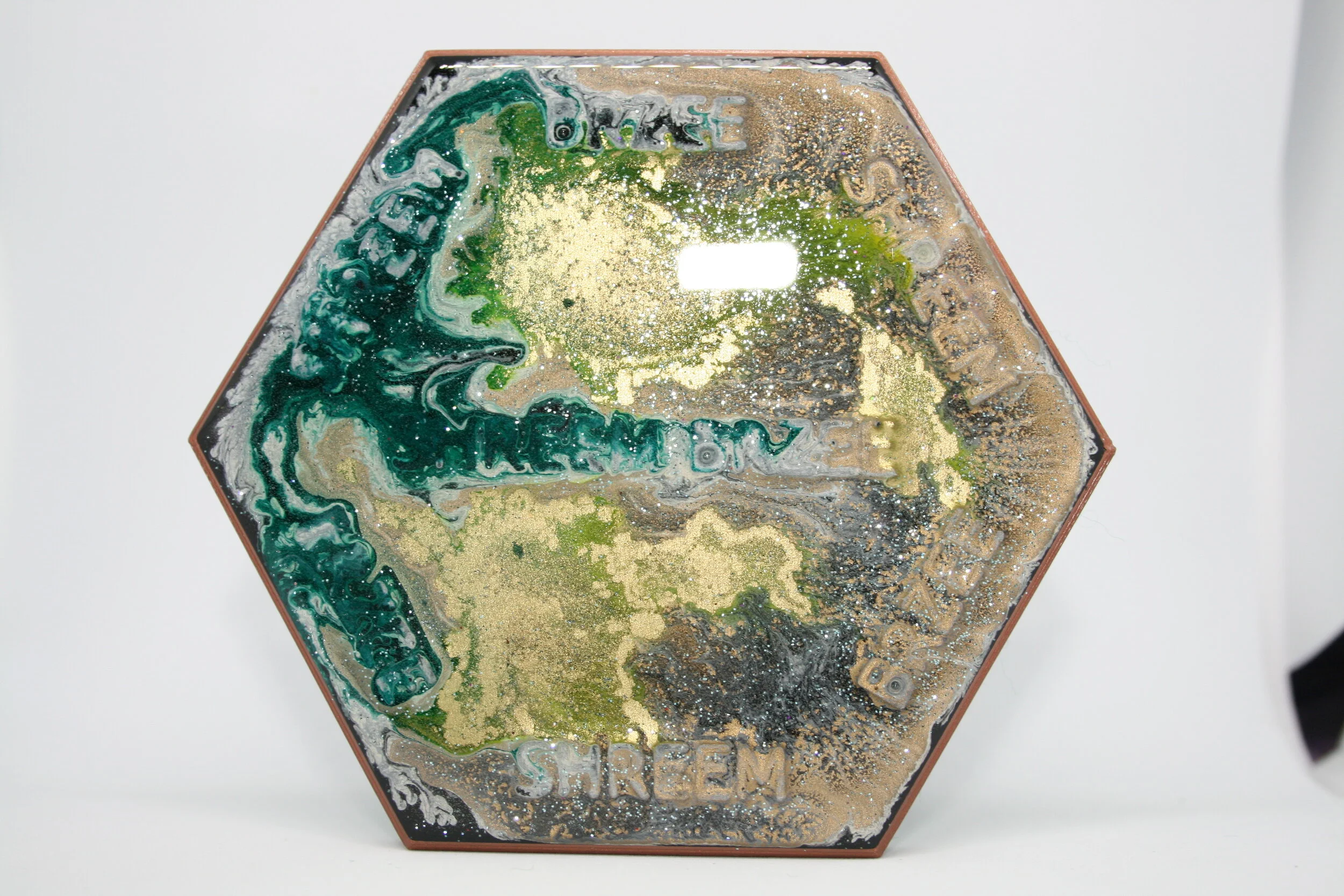 Shungite infused SHREEM BRZEE wealth mantra hexagon honeycomb lattice coasters with green felt backing in REAL COPPER METAL PLA. Alcohol ink, glitter, non toxic epoxy bar and table top resin.