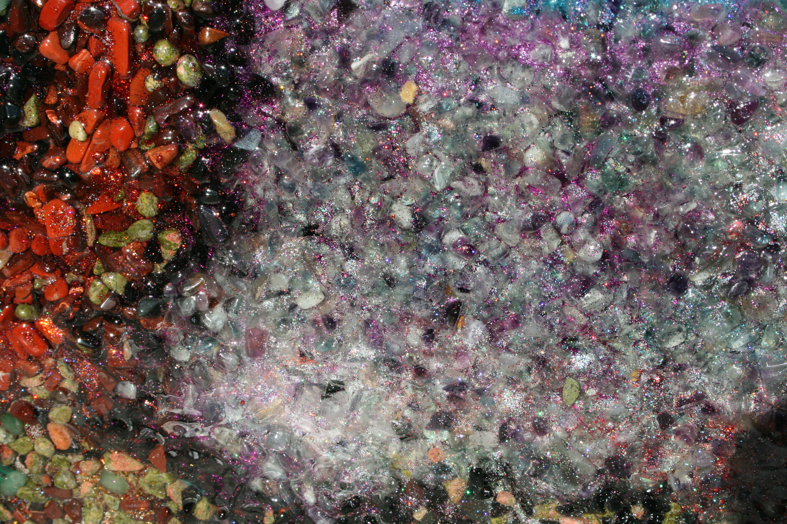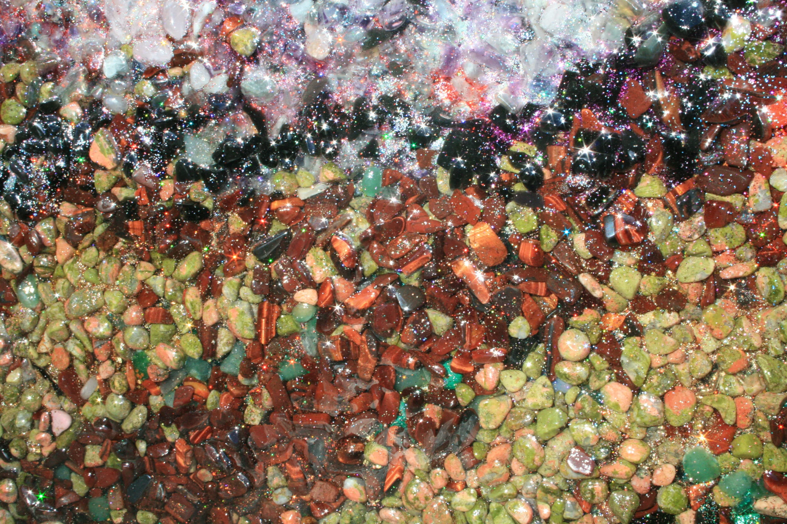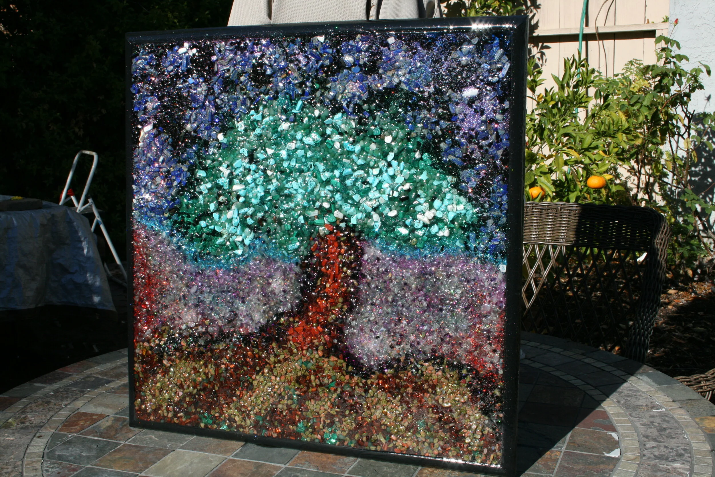 Change the energy of any space you put this painting into a positive atmosphere of warmth and love. Enjoy a new way of expressing the science of orgonite that has never been done like before! This piece is one of a kind and will be the only one of its kind made. Allow the glittering rainbows of color carrying subtle crystalline frequencies to permeate your senses and feel the tree of life from the root to the skies above. As you move the painting glints with holographic colors of light, as such it would look beautiful in a well lit room (sunlight reveals the most detail) where one could walk from one side of the painting to the other to admire its subtly changing opalescence. Because of how it was made, the ‘painting’ will become energetically more saturated over time and will become ‘stronger’. It is sure to inject the structure of whatever building you put it in with good energy over its lifetime. More than an art piece, this is a technology. Don’t miss out on achieving this one of a kind work which will never have a duplicate. This piece is made to withstand the test of time and will age like a fine wine to a perfect pitch of luscious harmonic frequencies.