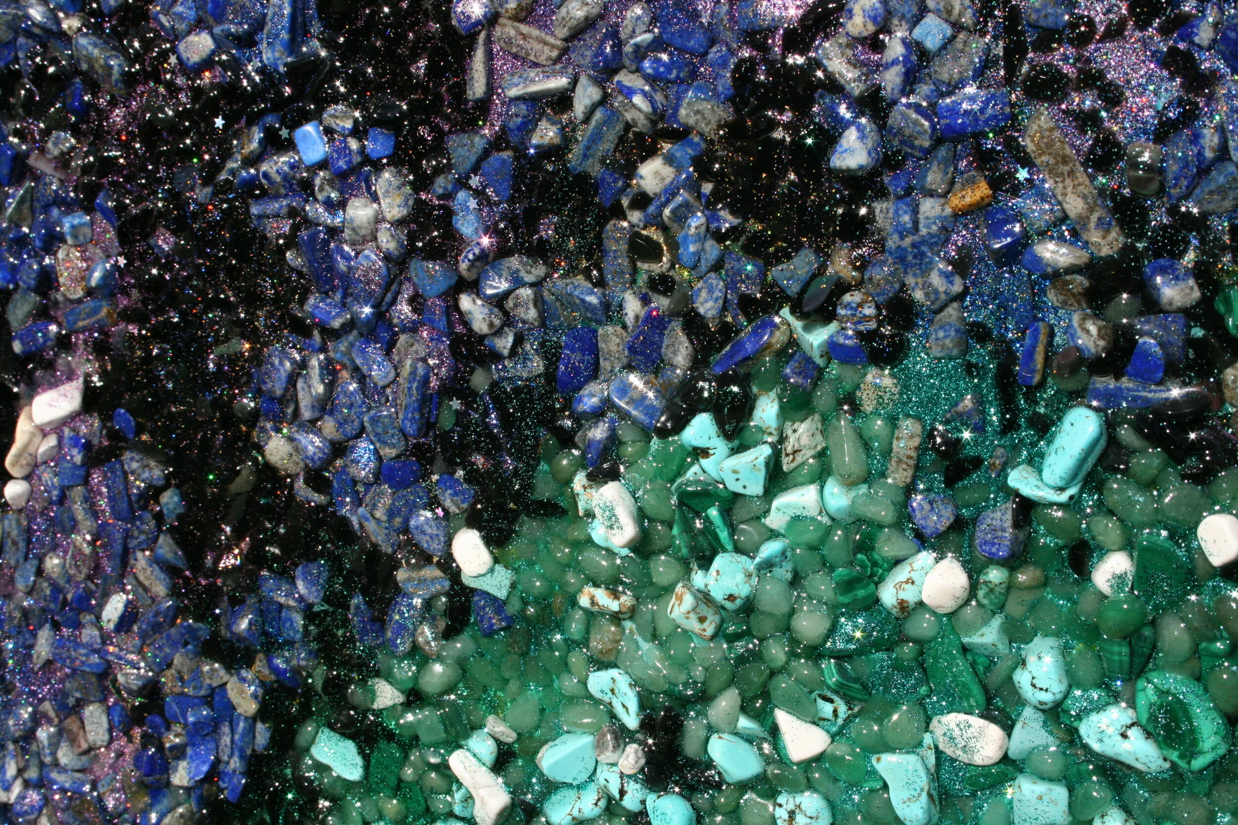 Experience the raw healing frequencies of Shungite, Lapis Lazuli, Turquoise, and 8 other powerful, beautiful crystals in this unique hybrid orgonite wall hanging depicting the Tree of Life. The crystals are set upon a bed of Shungite mixed with copper powder in non toxic epoxy resin, cleansing and clearing the crystals set above for your viewing pleasure. This is an interactive piece! Touch and feel the different parts of the ‘painting’ and experience the unique frequencies of the crystals within. All colors used in this piece come from the crystals themselves which are natural stones. Those who are receptive to subtle energies will find it difficult to not get a good feeling when looking at this painting. Because it is orgonite, being metal mixed with crystal in composition usually in resin, it will clean the energy of whatever room you put it in. When you look at the piece, it draws you in. Gaze at the calming night sky filled with mentally stabilizing Lapis Lazuli, psychically protective Obsidian, and nurturing Howlite. The intricate designs that adorn each crystal speak with their own volumes of information and pulls the eye, leading consciousness along the path of realization. Gazing turns into knowing. Just by holding vision on this piece and allowing your eye to naturally flow from one element to another, from the Fluorite landscape to the Malachite leaves, allows one to think easily thoughts of attaining abundance and luck. The Tiger’s Eye roots remind you to be stable in your foundation so that the life force energy depicted as red Carnelian can flow through your being and create the malachite leaves of prosperity.